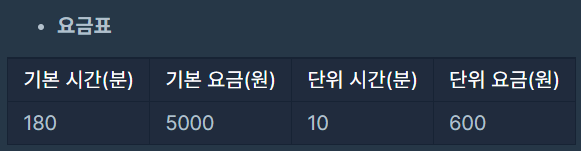 - 누적 주차 시간이 기본 시간을 초과하면, 기본요금에 더해서, 초과한 시간에 대해서 단위 시간마다 단위 요금을 청구합니다.