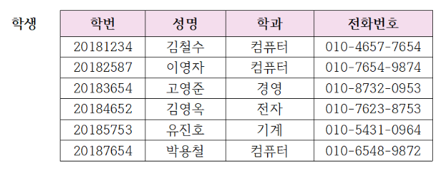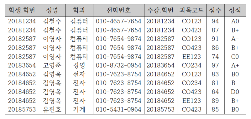 - 학생. 학번과 수강. 학번은 같은 정보인데 중복해서 나오게 된다.