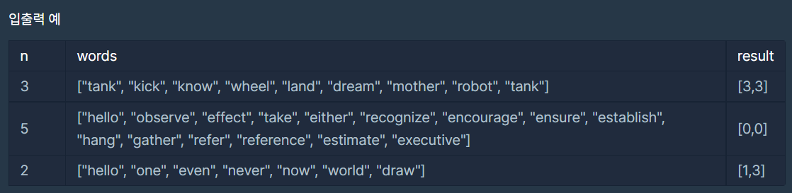 와 같은 순서로 말을 하게 되며, 이 경우는 주어진 단어만으로는 탈락자가 발생하지 않습니다. 따라서 [0, 0]을 return 하면 됩니다.